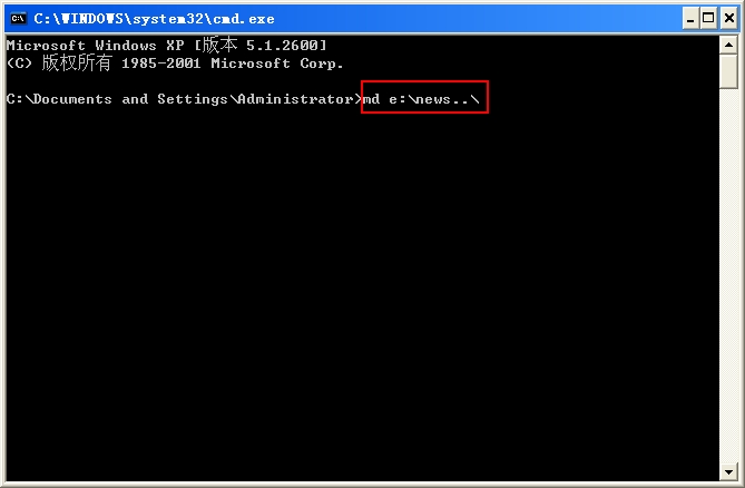 在CMD模式下,使用MD 命令建立文件夹,键入“md e:\news..\”,引号里的,注意,有二个点哦。回车后就可以看到在E :盘下有news.命名的文件了。。