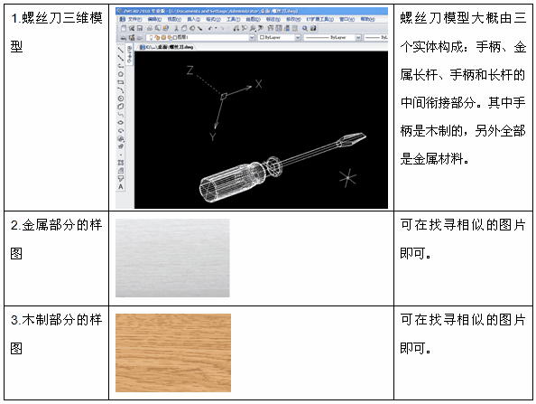 接下来,显示全部对象,准备为每个实体搭配材质。选择菜单“视图——渲染——材质”功能,命令行会有如下提示“指定材质到: <选择(S)>/图层(L)/颜色(C)/浏览(B):”,键入“S”,选择螺丝刀金属部分的两个实体,回车后进入材质指定对话框。在对话框中,点击左下角的新建对话框,新建一个具有金属特征的材质,如下图,输入新建的材质名称“金属部分”,图形类型选择“Image”,图像文件名里找到先前准备的金属样图,右侧的预览框内会显示图片的效果,最后保存,这样一个材质就建立好了。材质指定对话框中点击确定后,材质就加载到了实体上。