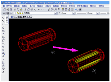 下面开始渲染准备,这次渲染的除螺丝刀手柄外,全是金属件,所以长杆和衔接部分的材质很好处理。而手柄上有两种材质,凹下去的部分是木制的材质,其它部分为红色油漆的材质。首先吧手柄选中,把手柄专门设一个图层,图层颜色为红色,这样手柄就成全红的了。接下来,选择菜单“修改——实体编辑——着色面”,选择手柄上凹下去的部分(可以不用一次全部选中),然后回车,会弹出颜色对话窗口,选择黄色,这样凹下去的部分被赋予了黄色。同理,把凹下去的部分全部都变为黄色。