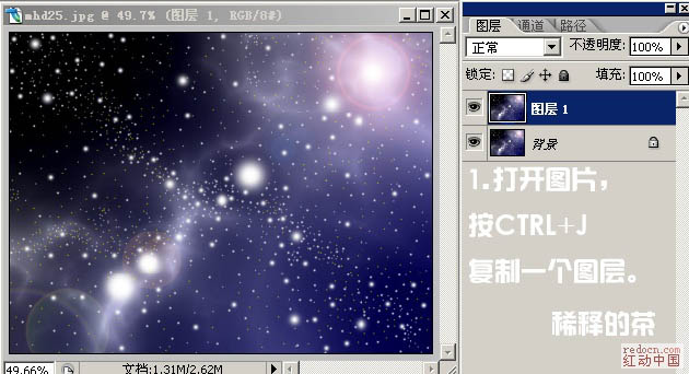 1、打开下图所示的星光背景素材(可以选择自己喜欢的背景素材),按Ctrl + J 把背景图层复制一层,如下图。