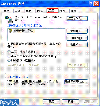 3、如果是拨号上网的用户,请先删除宽带的拨号连接,并选择"从不进行拨号连接" 。点击浏览器里面的工具---Internet选项----连接,如下图: