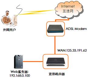 外网用户输入的是路由器WAN接口的IP地址125.33.191.62,而不是内部计算机的IP地址192.168.1.100。