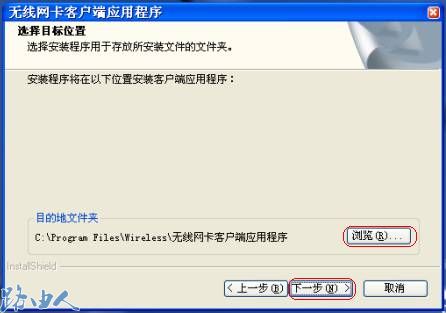 (3)点击下一步继续,安装程序提示您选择安装路径,默认安装路径为“C:\Program Files\Wireless\无线网卡客户端应用程序,如果您想改变安装路径请点击浏览选择路径,我们建议您保持默认路径,点击下一步;