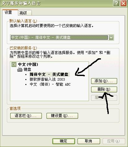 在弹出的下面窗口中,按箭头的指示,选中你不要的输入法,点删除!当你想要的时候,当然也可以从添加加进来!