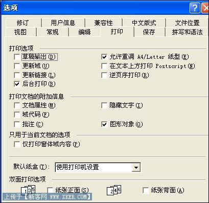 许多文档打印效果往往是由文档编辑软件中的打印选项控制的,如果对这些打印选项设置不当的话,那么打印效果走样的现象就不可避免了。例如在我们平时使用得最多的Word编辑软件中,就有许多选项直接影响着文档的打印效果;为了避免Word文档打印出来发生效果走样现象,我们需要将打印选项中影响输出效果的那些项目全部关闭掉。例如,要是将Word编辑窗口中的草稿打印功能启用的话,打印机在输出文档时将会把文档中的所有特效全部取消掉,如此一来输出来的文档效果和实际编辑时的效果就完全不一样了。在检查Word中的打印选项是否启用草稿打印功能时,可以在其编辑界面中单击“工具”菜单项下面的“选项”命令,然后单击其后设置界面中的“打印”选项卡,再看看图1界面中的“草稿输出”选项是否处于选中状态,要是该选项已经被选中的话,我们就必须取消它的选中状态。另外,Word文档中如果使用了草稿字体或动态文字效果的话,那么实际编辑页面中出现的字体效果和打印出来的效果也会有偏差,为了避免这样的偏差存在,我们尽可能在文字编辑时使用普通字体和一般效果;要做到这一点,我们可以单击编辑界面中的“工具”菜单项,从弹出的下拉菜单中单击“选项”项目,并单击对应选项设置框中的“视图”标签,然后将对应标签页面中的“草稿字体”项目取消选中就可以了。