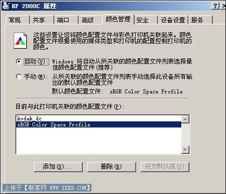 单击该窗口中的“颜色管理”标签,然后在如图2所示的标签页面中,检查一下我们是否已经选择了“手动”色彩配置方案,倘若是的话就必须请大家将该标签页面中的“自动”选项选中,然后单击其中的“确定”按钮;完成上述设置后,重新使用打印机来尝试打印文档材料,相信此时的页面效果不会走样变形了!