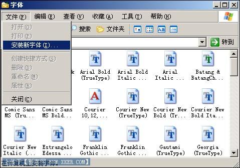 倘若在卸载应用程序或者删除材料的过程中,不小心将系统字库中的一些字体文件删除掉或破坏掉的话,那么以后文档材料中一旦包含有那些受损的字库字体时,打印机就无法将文档内容原汁原味地打印出来了,这样一来打印出来的效果看上去就好象变形走样了。为了避免由字体删除或受损造成的打印效果走样现象,我们应该尽可能地将文档编辑界面中的那些复杂字体格式全部取消,而改用普通常见的那些字体来编辑文稿内容。另外一旦发现打印出来的页面中出现了乱码现象的话,则说明系统的某些打印字体文件受到了损坏,此时需要打开系统的控制面板窗口,并双击其中的字体图标,在弹出的字体文件列表窗口中依次点击菜单栏中的“文件”/“安装新字体”命令(如图3所示),然后在接着打开的字体安装窗口中,将那些受损的字体文件重新安装一下就可以了。