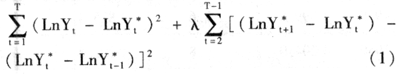 HP滤波法主要是通过将(1)式最小化来估算潜在产出值(T为样本期):