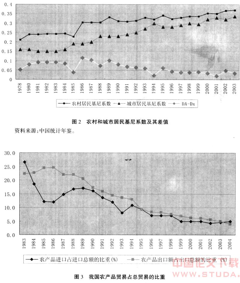 因此,对外开放对再配置效应的影响也是分析对农业基尼系数的影响。如果是提高了农业收入的差距,则是有利于降低总体基尼系数,如果是降低了则是相反。国际贸易和国际投资对农业的影响可以分为结构和价格两个方面。开放可能带来农业产出结构的调整,在与国际市场价格的接轨中,农业资源配置会发生变化,相同质量的土地和劳动在不同开放地区的收益会发生差异。其二是价格的影响,由于国际贸易和外资收购,相同产品的价格会发生变化。但是,笔者认为从全国范围来看,无论是外资进入还是国际贸易,对农业收入的影响是有限和间接的。首先,我国引进外资在第一产业的比重一直偏低,2004年外资对农、林、牧、渔业的投资总额为我国引进外资投资总额的1.15%;其二,我国农产品国际贸易占总贸易的比重也是逐年下降的(见图3)。