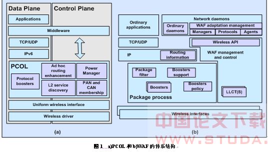有必要提供一个通用的平台来保证信息在不同协议层和实体之间传送。PACWOMAN已经将这个平台命名为PAN和CAN优化层(PCOL), 6HOP称它为无线适应框架(WAF)。PCOL是一种为PAN和CAN提出的特定解决方案,而WAF更适用于多跳环境的无线网络。图1中给出了PCOL和WAF的体系结构。