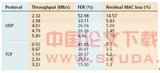 MANNET路由规范的主要缺点之一就是目前只用米/跳数来决定到达目标节点使用的路由路径。在一些情况下,无论是从能源消耗还是性能角度来看,其都不能达到最优的方案或是较好的方案。如果实验中应用已有的“标准”MANET协议,如动态资源路由(DSR)和ad hoc按需距离向量(AODV)路由协议,在MT1和MT3之间建立一个直接的路径,因为它们彼此都在对方的发射范围之内。第一部分的测试使用这种方式来完成,应用UDP、TCP协议。表1总结了主要的测试结果,其中有三个不同的指标(吞吐量;帧出错率FER和残余MAC丢失,即通过IEEE802.11重复请求机制没能重新获得的包的数目)。