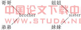 应注意,首先,在该语义场中参加比较的是亲属词 的基 本形式,而英语 中的“elder brother”“younger sister”等并非是该称谓的基本形式其次,正如贾彦德 指出的“汉语虽然也有 ‘兄弟(‘弟’不轻读)、‘姐妹’这样的词,但那是指称哥哥和弟弟、姐姐和妹妹。如果只指某个由一层同胞关系形成的亲属,汉族人一定要讲清楚是哥哥还是弟弟,是姐姐还是妹妹,决不含糊 。”可见,对于同胞 关 系 这 一 语 义 场 ,英 语 是 用 “brother”“sister”两个 词来进 行分 割,而汉语用 的是 “哥哥”、“弟弟”、“姐姐”、“妹妹”四个词来分割,称呼时不仅要区分性别 ,而且要区分长幼。