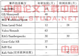 初审法院对并购裁决的司法审查通常会持续很长时间。据国际商会(ICC)统计.初审法院的审理时间平均为32个月.欧洲法院的平均审理时问也达到29个月即使启用快速审查程序也要超过7个月。在并购领域.商业时机稍纵即逝而在Kali与Salz并购案中.经过长达4年的审查后。欧洲法院才撤销了委员会附条件同意的裁决。这种拖延实质上剥夺了并购方寻求法院救济的实体利益。下表是部分并购案件的审理时间表:
