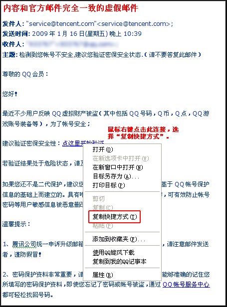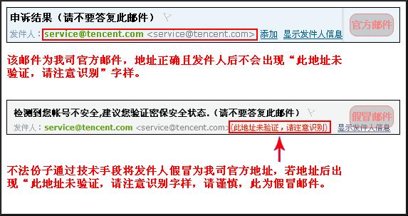 最近有用户举报,收到假冒腾讯公司名义发出的诈骗邮件,欺骗用户到非腾讯官方网站输入密码和密保资料,导致密码及密保相关资料被盗。邮件的大意是:您的号码申诉成功,或者您的号码存在异常,需要用户修改密码、设置验证密保。 盗号者使用非法技术手段摸拟任意发件人的地址(如模拟成腾讯官方邮件地址service@tencent.com),此类虚假邮件具有极高欺骗能力,腾讯公司提醒广大QQ用户注意识别此类虚假邮件。 鼠标右键点击链接,选择“复制快捷方式”,如下图: 方法1(官方验证): 则为腾讯官方网址,该邮件可信。若显示: 则为非腾讯官方链接,若进入相关网址出现提示输入QQ密码等私密信息,请勿相信。若显示: 则为恶意、假冒网址,请勿点击。 方法2(人工识别): 若不是紧跟“/”,则为非官方地址,请注意识别。点击http://service.qq.com/info/5141.html 了解如何识别腾讯网站。 识别方法1(QQ邮箱用户特有) 识别方法2(QQ邮箱用户特有): 温馨提示:假冒邮件样本: