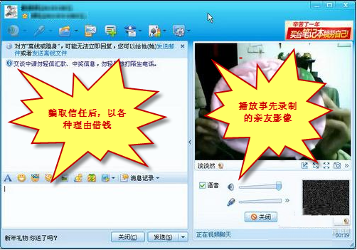 为防止露出破绽,有时不法分子会以话筒损坏等为由,避免语音聊天。另外,有的不法分子还会借取得信任之机,传送木马病毒文件,从而盗取用户机器上的网上银行、网游帐号、邮箱等个人帐号资料,给用户造成极大损失。