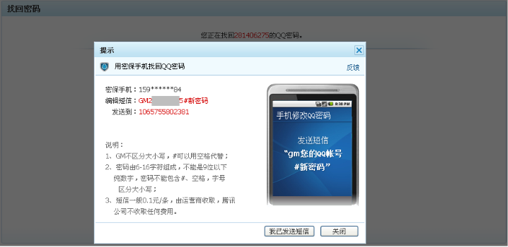 通过密保手机发送短信找回密码