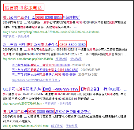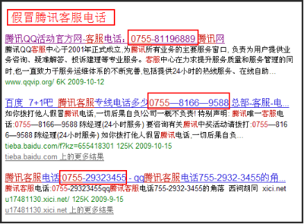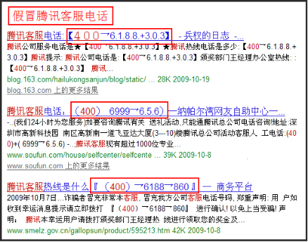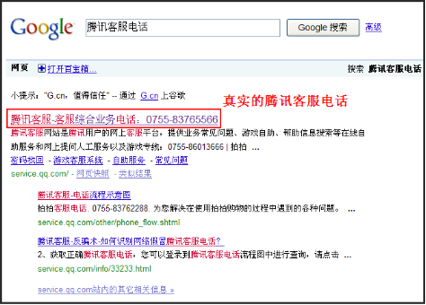 近期腾讯公司收到热心用户反馈的欺诈信息,发现这些案例中都出现了一些虚假的腾讯客服电话。我们根据不法分子惯用的诈骗手段整理了识别网络假冒腾讯客服电话的一些常见方式,请您仔细阅读,以防上当。 辨别方法:腾讯真正的客服电话为 0755-83765566 案例一: 欺诈者留下假冒的客服电话,甚至故意用短线拆分号码,增加迷惑性,比如:最近大量诈骗都利用海南区号0898进行诈骗。 假冒客服热线:089-8880-8XXX-XXXX,行骗者故意拆分号码,其实是:0898(海南区号)-8808XXXX(电话)-XXX (分机) 案例二: 使用网络搜索“腾讯客服电话”、“QQ客服电话”会出现(区号0898或020等)的假冒客服电话,请广大网民提高网络安全意识,注意识别假冒腾讯客服电话。 诈骗分子使用的0898开头的假冒腾讯客服电话: 诈骗分子使用的400开头的假冒腾讯客服电话: 诈骗分子使用的0755开头的假冒腾讯客服电话: 目前有部分用户不知道腾讯公司的客服电话,腾讯官方的建议是:登录腾讯客服网站获得正确的客服电话。 客服电话指引页面:http://service.qq.com/other/phone_flow.shtml 温馨提示: 如果您习惯用网络搜索查找腾讯客服电话,请注意辨别搜索结果的真伪。 您可以通过soso、百度等搜索引擎输入“腾讯客服电话”或“QQ客服电话”即可获得。