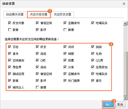 第二步:选择‘关注内容设置’,在‘选择您需要关注好友空间的哪些更新信息’中自行选择您需要关注好友的类别,如若不想关注好友的日志,在‘日志’前把勾去掉;
